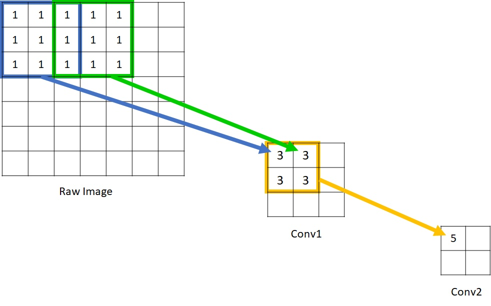 如图所示的原始图像,经过kernel_size=3, stride=2的Conv1,kernel_size=2, stride=1的Conv2后,输出特征图大小为,很明显,原始图像的每个单元的感受野为1,Conv1的每个单元的感受野为3,而由于Conv2的每个单元都是由范围的Conv1构成,因此回溯到原始图像,每个单元能够看到大小的区域范围。